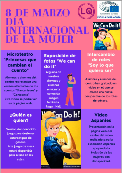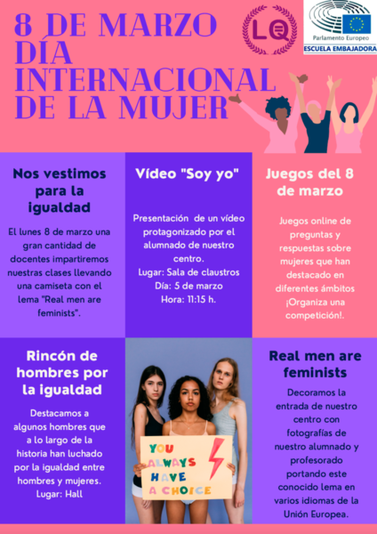 Todas las actividades, que se realizarán durante toda la semana, han sido coordinadas por el Equipo de Igualdad real entre hombres y mujeres, el Departamento de Actividades Extraescolares y los Embajadores del IES Leopoldo Queipo como Escuela Embajadora del Parlamento Europeo.