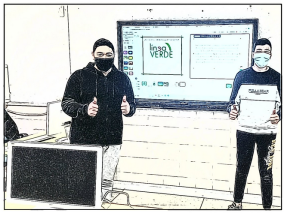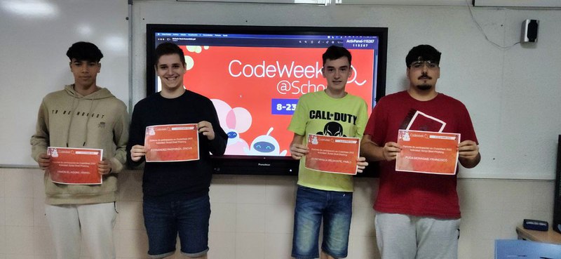Los finalistas de la actividad presencial con los alumnos de grado medio y sus diplomas de participación en la Codeweek, de izquierda a derecha son: Ismael Mimon El Aouad, Óscar Fernández Pastoriza, Pablo Quintanilla Belmonte y Francisco Puga Monagas ¡Enhorabuena!