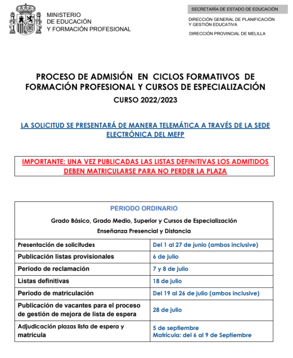 Descargue el calendario del proceso de admisión y la oferta formativa de Melilla en los enlaces infereiores.