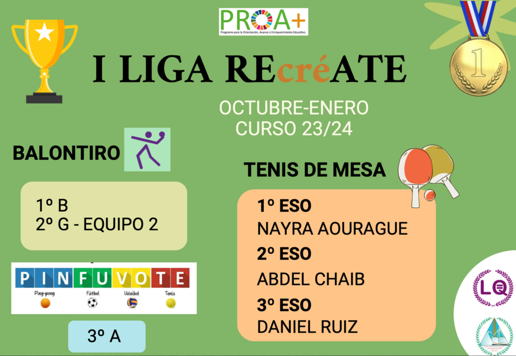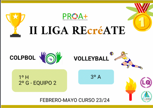 En enero finalizaron las ligas deportivas de balontiro y pinfuvote iniciadas en octubre con nuestro plan REcréATE y se proclamaron ganadores 1º B, 2º G equipo 2 y 3º A. Hace unos días fue la entrega de premios. ¡Enhorabuena a los ganadores!