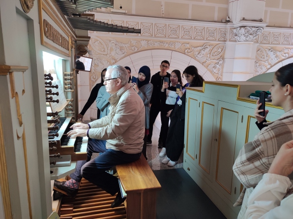 Allí pudieron disfrutar de las explicaciones, por parte de Javier Monreal antiguo profesor del IES Leopoldo Queipo, sobre la historia de este instrumento, su funcionamiento, el tipo de interpretación, las posibilidades sonoras, etc. Un instrumento de viento muy difícil de ver en directo y que tenemos la suerte de contar con dos en nuestra ciudad.