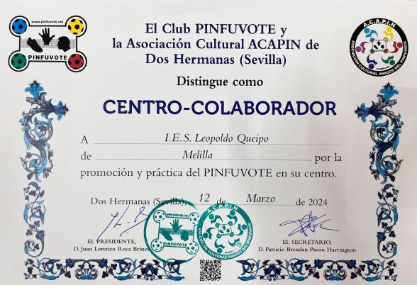 El IES Leopoldo Queipo ha recibido un reconocimiento por haber trabajado el pinfuvote durante el curso y darle difusión a través de nuestros recreos activos. Queremos agradecer a Juan Lorenzo Roca por su implicación en este proyecto, desde este instituto seguiremos trabajando este contenido por ser muy enriquecedor para el alumnado.